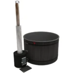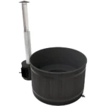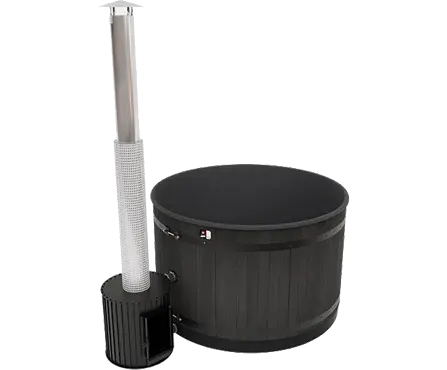 Le spa est chauffé par un poêle externe argenté, parfaitement adapté aux bassins de taille moyenne (M), avec des connexions discrètes situées à l’arrière du poêle.